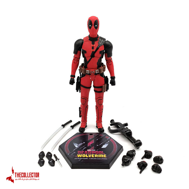 محتویات-جعبهاکشن فیگور ددپول, پایه نگهدارنده, چهار دست اضافه, دو عدد کاتانا, یک عدد چاقو