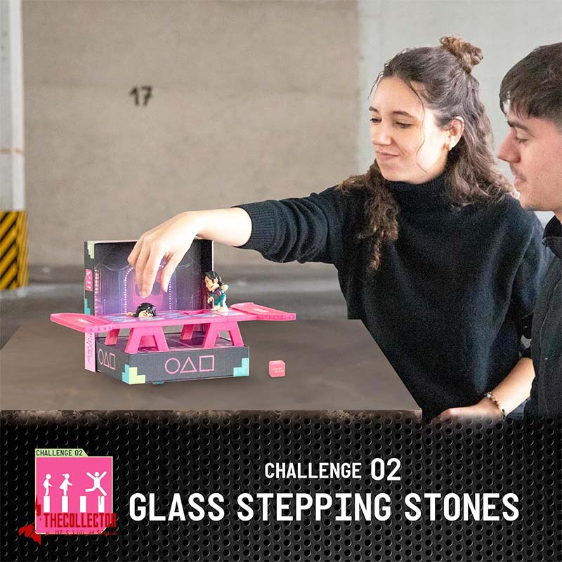 ست Squid Game Glass Tile Challenge از IMC Toys شامل مینیست و فیگور. الهام گرفته از پل شیشهای سریال نتفلیکس، مناسب بازی و کلکسیون.